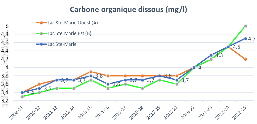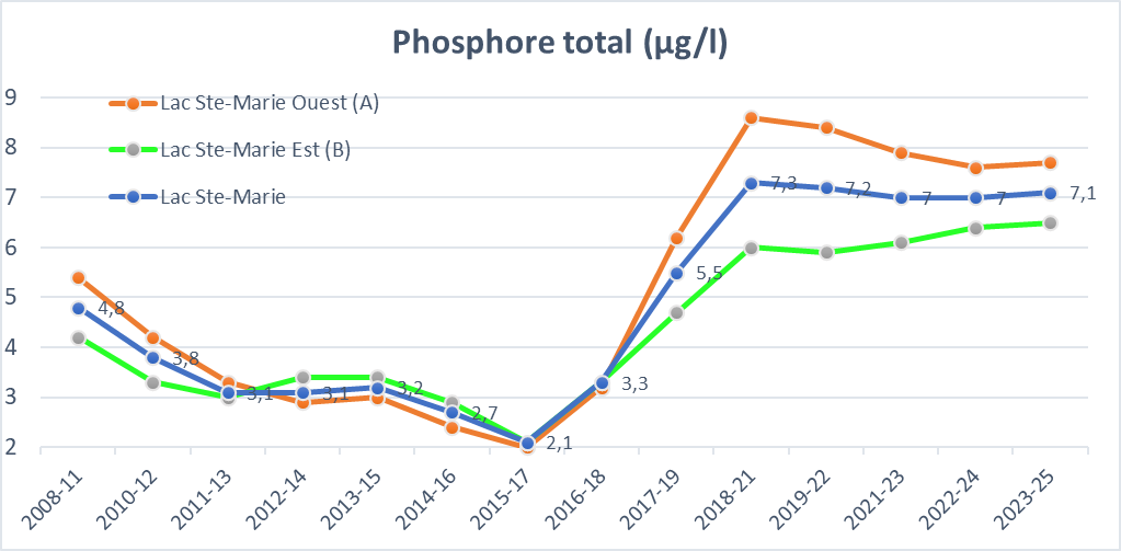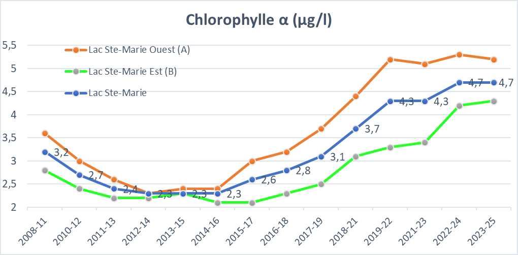Pour chaque station, les résultats sommaires sont publiés annuellement sur le site du ministère (voir les résultats pour le lac Ste-Marie).