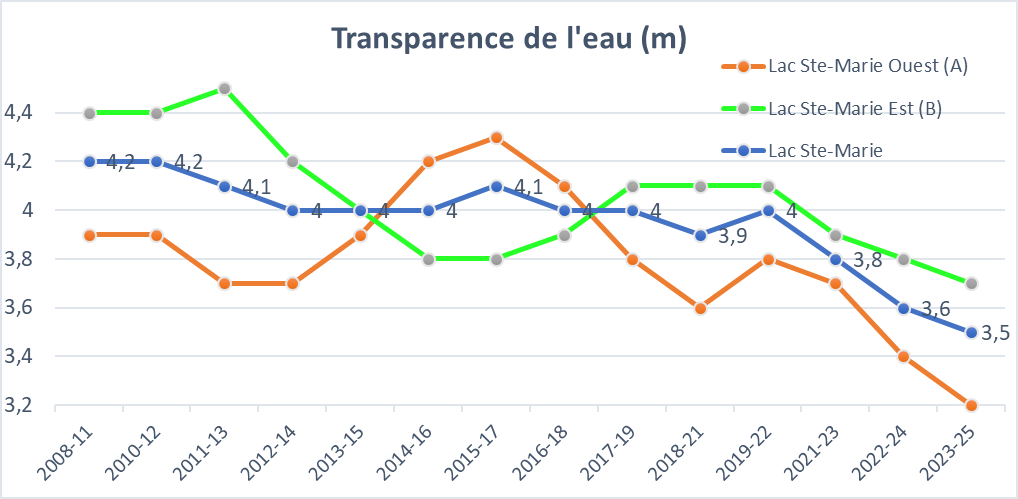 L’analyse des données recueillies à chacune des stations de surveillance montre que l’eau du lac Ste-Marie se dégrade de façon importante depuis 2015. Elle permet de situer l’état trophique du Lac Sainte-Marie à la limite de la zone de transition Oligo-mésotrophe et très près de la zone Mésotrophe. Notre lac présente des signes d’eutrophisation.